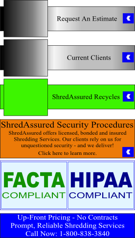 Uncompromising Data Destruction Compliance Standards Ensure Your Materials are Destroyed Confidentially and Securely Beyond Recognition, Reconstruction and Readability. Our philosophy is “security above all else”, which creates a real difference that most of our competitors can’t match. ShredAssured Confidential Paper Shredding and Data Destruction is Both FACTA and HIPAA Compliant. Click Here to Learn More. ShredAssured is committed to protecting our environment through our Reduce, Re-Use and Recycling programs. It’s safe, secure and environmentally responsible. Current ShredAssured Clients, Please Click Here. Click Here to Receive A Free Price Estimate.