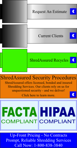 Uncompromising Data Destruction Compliance Standards Ensure Your Materials are Destroyed Confidentially and Securely Beyond Recognition, Reconstruction and Readability. Our philosophy is “security above all else”, which creates a real difference that most of our competitors can’t match. ShredAssured Confidential Paper Shredding and Data Destruction is Both FACTA and HIPAA Compliant. Click Here to Learn More. ShredAssured is committed to protecting our environment through our Reduce, Re-Use and Recycling programs. It’s safe, secure and environmentally responsible. Current ShredAssured Clients, Please Click Here. Click Here to Receive A Free Price Estimate.